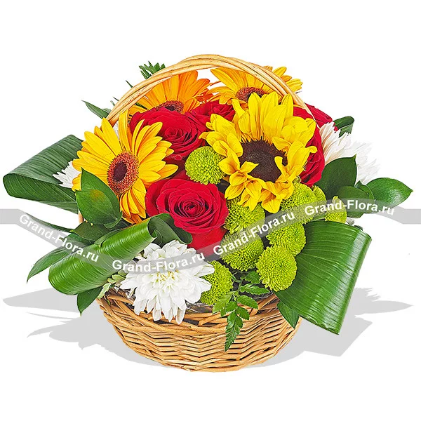 Стандартный (на фото): роза красная - 5 шт, гербера желтая - 3 шт, подсолнух - 1 шт, хризантема кустовая зеленая - 2 шт, хризантема кустовая белая - 1 шт, папаратник - 3 шт, лист аспидистры - 3 шт, рускус, оазис, корзина.