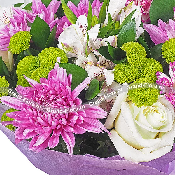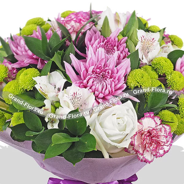 Стандартный (на фото): хризантема одноголовая фиолетовая - 5 шт., хризантема кустовая зеленая - 3 шт., альстромерия белая - 3 шт., роза белая - 3 шт., гвоздика одноголовая фиолетовая - 3 шт., рускус, фетр фиолетовый.