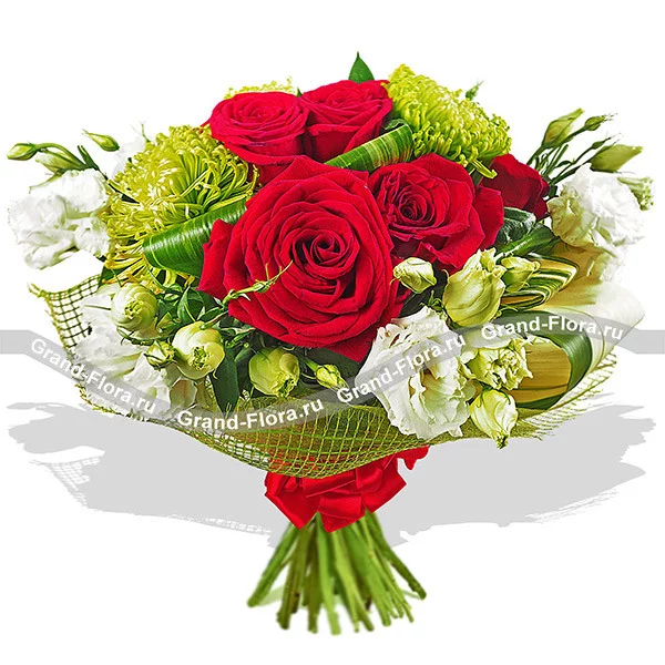 ДЕЛЮКС: роза красная -  19 шт, хризантема одноголовая зеленая - 12 шт, эустома белая - 10 шт, лист аспидистры загнутый - 8 шт, сетка зеленая. Примерный размер: 45Х45 см.