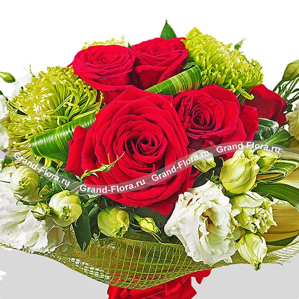 ЛЮКС: роза красная - 13 шт, хризантема одноголовая зеленая - 8 шт, эустома белая - 6 шт, лист аспидистры загнутый - 5 шт, сетка зеленая. Примерный размер: 35Х35 см.