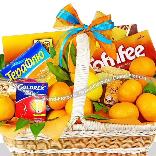 Люкс: мандарины - 0,5 кг, лимон - 1 шт, Toffifee - 1 уп., печенье "Alpen Gold" - 1 уп, коробка конфет "Alpen Gold" - 1 шт, Мед (500 г.) - 1шт, Coldrex МАКС Грипп - 1уп., ТераФлю - 1 уп, корзина средняя, декор.