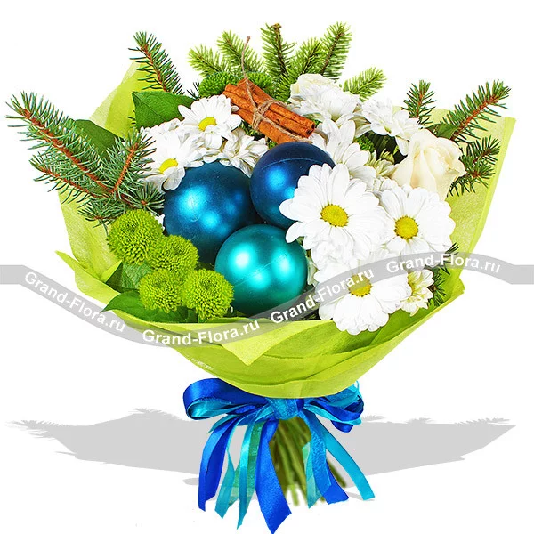ДЕЛЮКС:  хризантема белая - 9шт., роза белая - 5шт., хризантема зеленая (сантини) - 5шт., еловая ветвь - 6шт., корица - 2шт., новогодний декор и зелень, фетр.