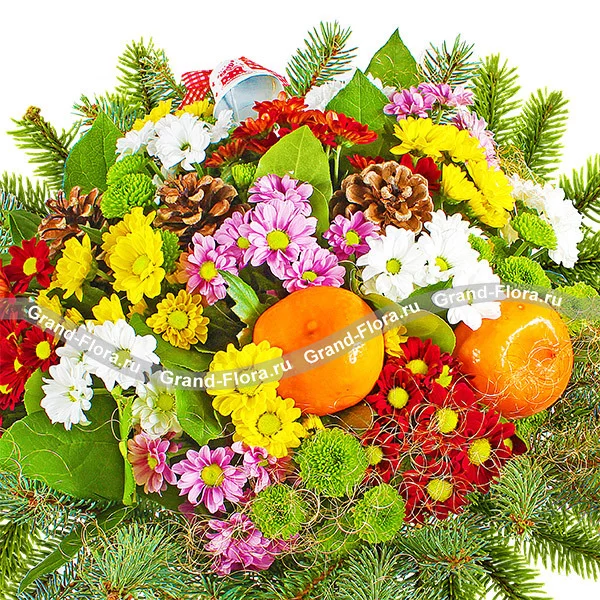 Уменьшенный: хризантема кустовая белая - 2шт., хризантема кустовая желтая - 2шт., хризантема кустовая красная - 2шт., хризантема кустовая розовая - 2шт., хризантема зеленая (сантини) - 2шт., еловая ветвь, новогодний колокольчик, новогодний декор и зелень, сетка.