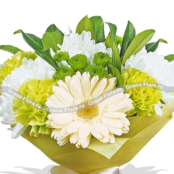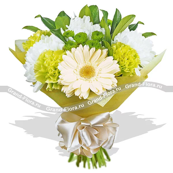 Стандартный: гербера кремовая - 2 шт., гвоздика зеленая - 3 шт., хризантема одноголовая - 3 шт., хризантема зеленая (сантини) - 2 шт., декоративная зелень, фетр желтый, бант белый.
