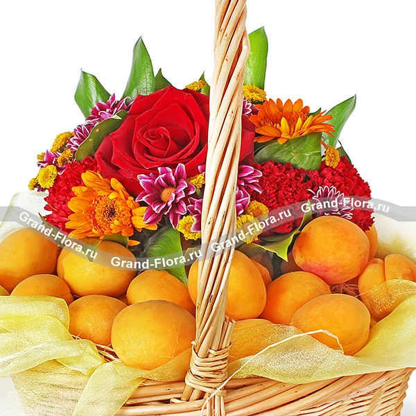 Стандартный: роза красная - 1 шт., гвоздика красная - 3 шт., гербера - 2 шт., хризантема фиолетовая - 1 шт., хризантема желтая (мелкоцветная) - 1, рускус - 2 шт., оазис, фетр желтый, корзина малая, абрикосы - 1,5 кг.