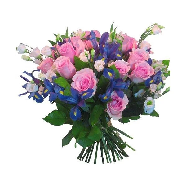 Стандартный: роза розовая 15 шт., ирис - 9 шт., эустома белая - 9 шт., лента белая.
