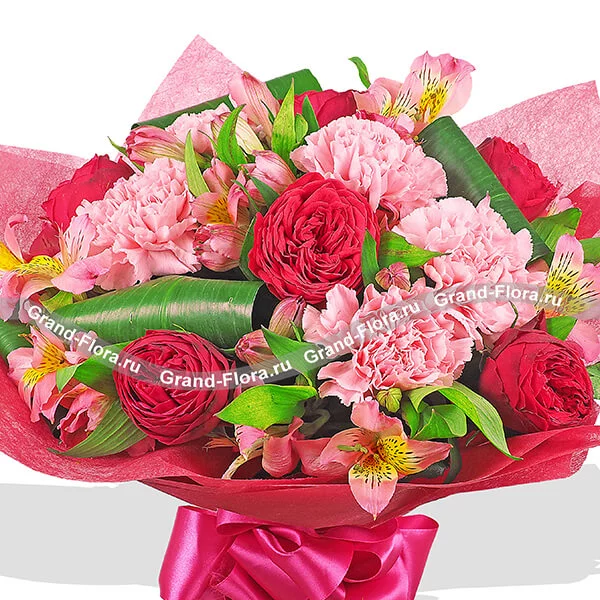 ДЕЛЮКС: роза красная - 15 шт, гвоздика розовая - 18 шт, альстромерия розовая - 14 шт, лист аспидистры загнутый - 9 шт, фетр красный.Примерный диаметр букета 50х50 см. r