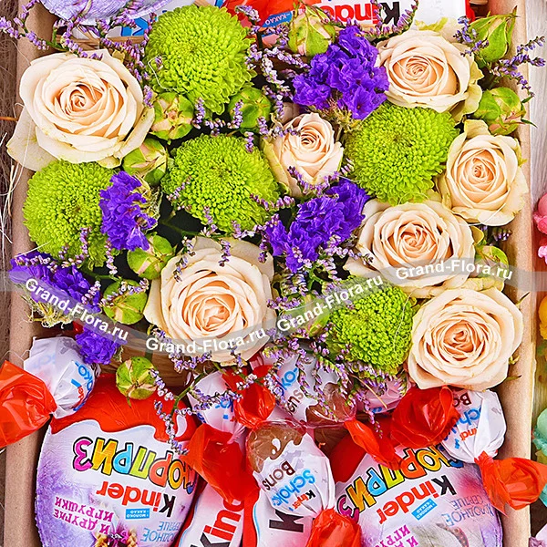 Стандартный: роза кустовая белая 2 шт., хризантема кустовая зелёная - 1 шт., статица - 2 шт., макаруны., киндер сюрприз яйцо - 3 шт., киндер шоколад., киндер choco bons., послания в письме., оазис ., коробка.