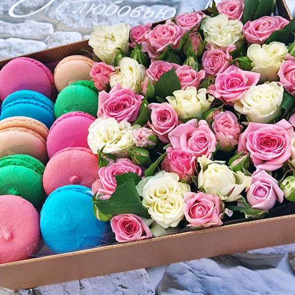 Доставка данной композиции возможна только по России! Возможна замена макарунов на зефир или конфеты Raffaello. Дизайн коробки может отличаться от картинки! Просим оформлять данный вид композиции заранее