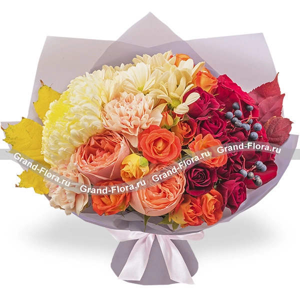 Стандартный: хризантема одноголовая - 1 шт., роза кустовая оранжевая - 2 шт., хризантема кустовая желтая - 2 шт., гвоздика персиковая - 2 шт., роза красная - 2 шт., роза кустовая красная - 2 шт., роза персиковая - 2 шт., декор, упаковка, лента.