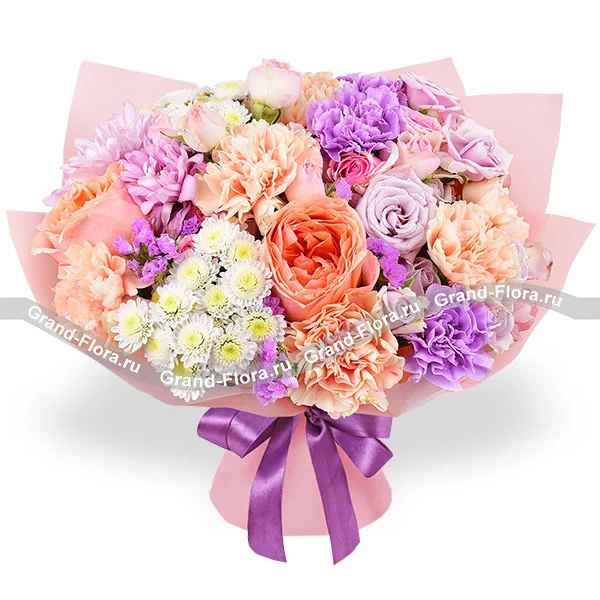 Стандартный: роза персиковая - 2 шт.,гвоздика персиковая - 5 шт., гвоздика фиолетовая - 2 шт., роза кустовая розовая - 2 шт., роза кустовая фиолетовая - 2 шт., хризантема кустовая ромашковая фиолетовая - 2 шт., хризантема сантини - 2 шт., статица, упаковка, лента. Примерный размер: 35Х35 см.