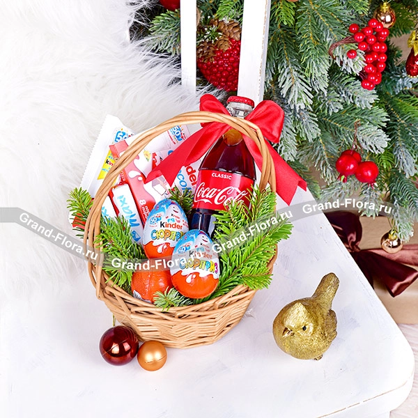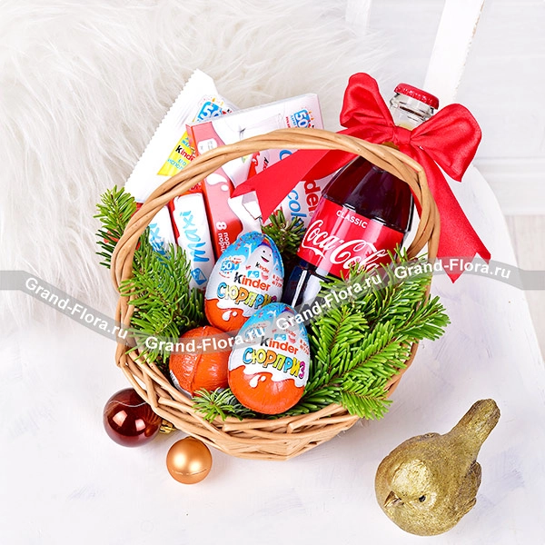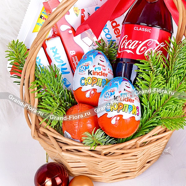 Стандартный: Coca-Cola - 0,33 л., Kinder Chocolate - 100 г., Kinder Maxi - 80 г., Kinder Chocolate со злаками - 94 г., Kinder сюрприз - 3 шт., ель, бант, корзина малая.
