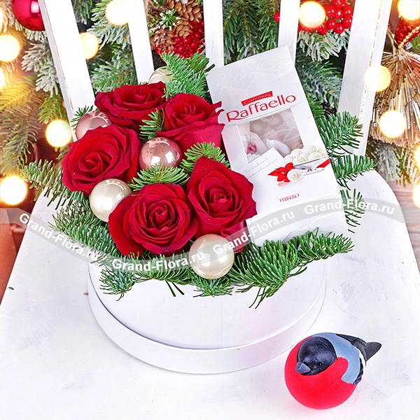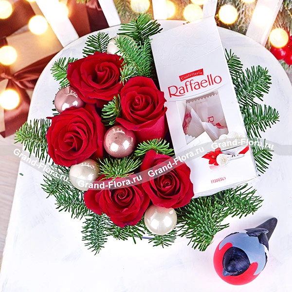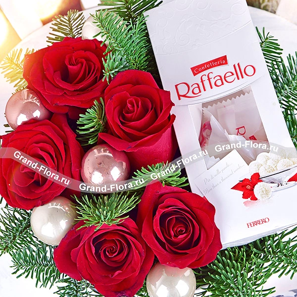 Стандартный: красные розы - 5 шт., мини шарики - 5 шт., конфеты "Raffaello" - 80г., ель, оазис, коробка.