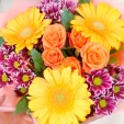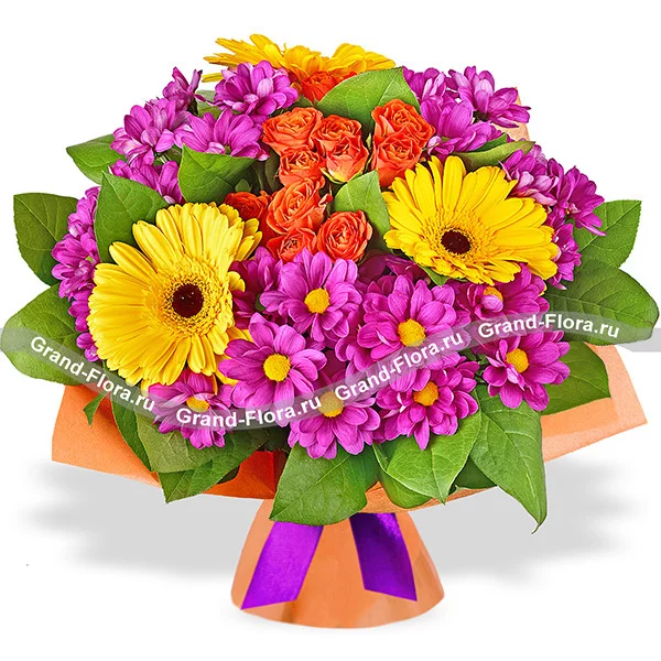 Аккуратный и стильный букет непременно вызовет восхищение своего счастливого обладателя. Сочетание оранжевых кустовых роз и фиолетовой хризантемы на фоне крупных цветков желтой герберы подчёркнуто насыщенно-зелёными листьями салала. Совершенство можно подарить, когда оно воплощено в цветах.